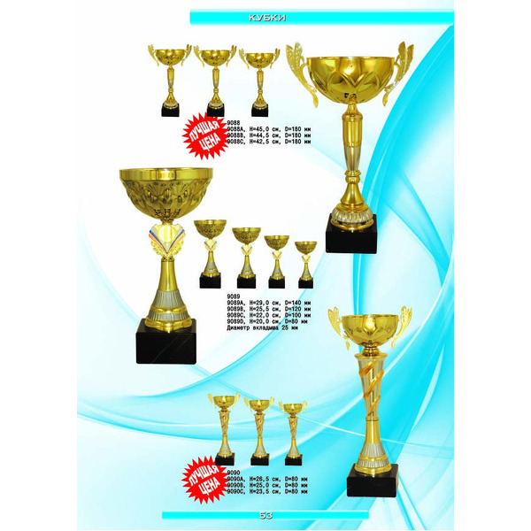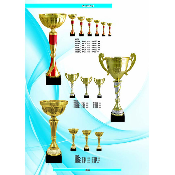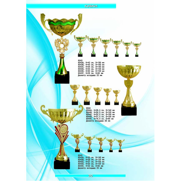 На нашем сайте вам будет удобно подобрать по иллюстрированному каталогу и заказать наградные кубки из металла и пластика, а также другие виды наградной продукции. В ассортименте представлены самые разнообразные по габаритам, форме, цветовой гамме и дизайну кубки, которые можно использовать для награждения победителей в различных соревнованиях, а также в качестве подарочной корпоративной продукции. У нас вы можете не только приобрести кубок, но и заказать нанесение на него различных надписей и изображений с применением технологии гравировки лазерным лучом.