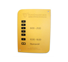 Элегантные рекламные вывески из металла прекрасно подойдут для оформления интерьеров бизнес-центров, отелей, административных зданий. Такие вывески могут быть изготовлены из анодированного алюминия, полированной и зеркальной нержавеющей стали, а также латуни. Металлические вывески отличаются долговечностью и респектабельным внешним видом, поэтому их охотно используют для крепления на дверях кабинетов руководителей, конференц-залов, шоу-румов, юридических фирм, финансовых организаций.