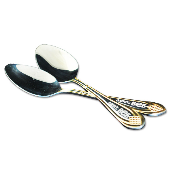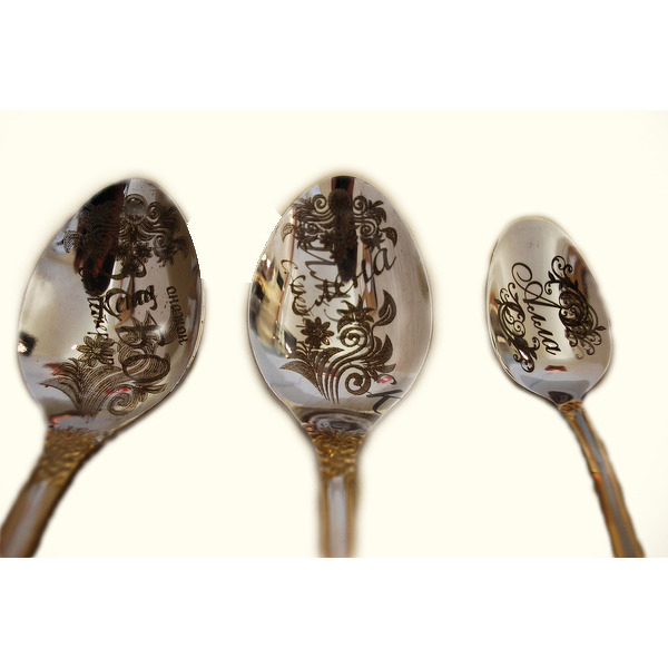 Важно отметить, что лазерная гравировка на ложках позволяет создавать цветные изображения. Оттенок зависит от металла, из которого выполнено изделие. Так, например, на ложке из нержавеющей стали цвет рисунка будет темно-серым. Если металл благородный — золото, платина или серебро, цвет изображения будет приближен к эффектному белому. В большинстве случаев предугадать цвет очень сложно, т.к. для изготовления столовых приборов используются самые разные типы сплавов. Если вы покупаете ложки из каталога нашей компании, то наши специалисты смогут с точностью определить каким будет результат.