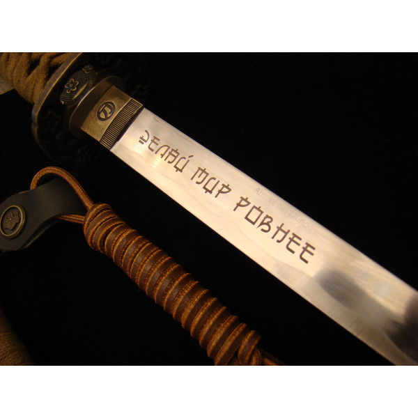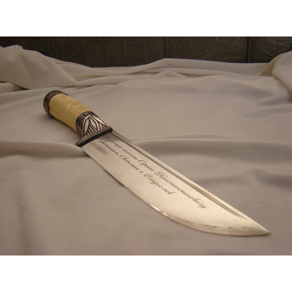 Гравировка придает оружию более элегантный вид, делает его уникальным, по-настоящему именным подарком. Обычно ножи, кортики и другие виды холодного оружия приобретают в подарок мужчинам. Подарочную надпись на клинке подбирают, учитывая размер оружия. Для того, чтобы ровно разместить текст, нужно не менее 5 см. Для подарка мужчине выбирайте ножи из качественной стали, такое оружие можно приобрести в охотничьих магазинах или на заказ. Желательно не заполнять всю поверхность лезвия гравировкой, поскольку после использования на рыбалке или охоте нож будет довольно сложно очистить.