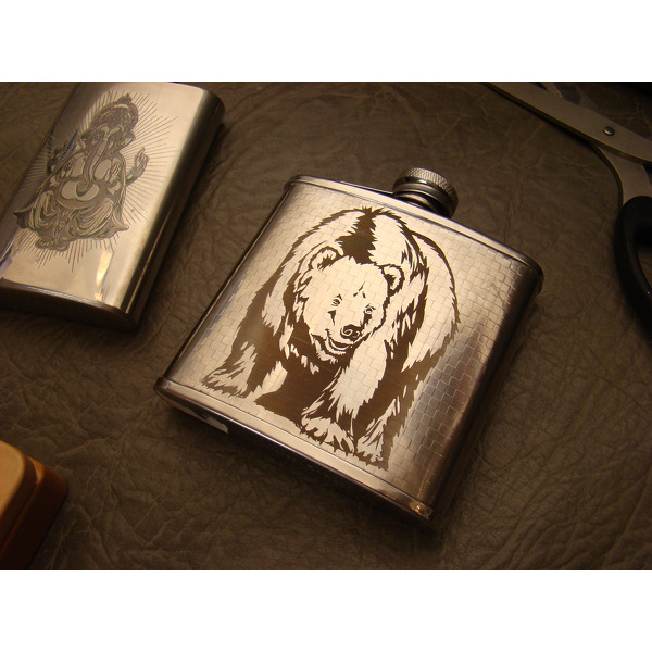 Впрочем, гравировка на фляжках пользуется спросом и среди корпоративных заказчиков, особенно если в компании работают по большей части мужчины. В этом случае уместно нанесение логотипа, слогана, символа компании. Фляга, украшенная таким способом, станет хорошим подарком для делового партнера. Если вас интересует лазерная гравировка на фляжках для личного подарка — можем предложить перенести на корпус изображения с фотоиллюстраций любых музыкальных исполнителей, актрис, певцов или же сделать точную копию собственного портрета или портера получателя подарка.