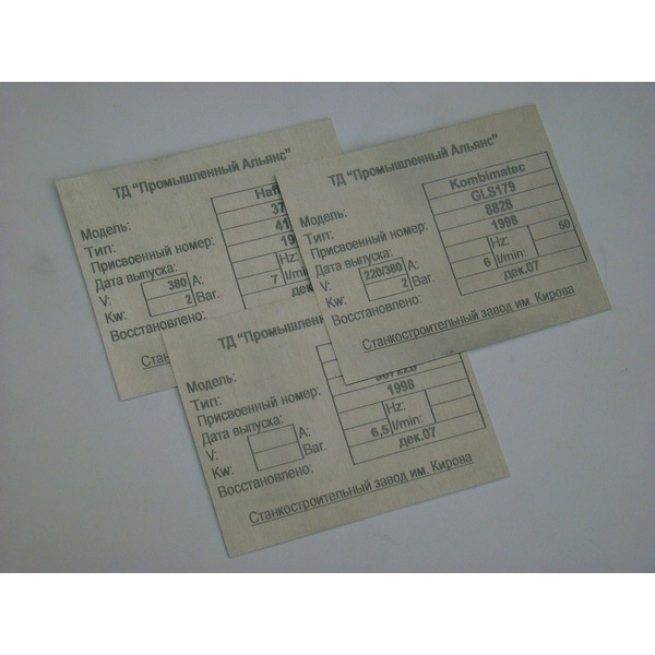 Лазерная маркировка шильд в Москве и Спб. Изготовление шильд с лазерной гравировкой из нержавеющей стали, алюминия, латуни, меди и др. металлов, пластика. Лазерная гравировка изображения на шильдах методом испарение предварительно нанесенной порошковой краски, снятие поверхностного слоя материала.