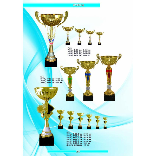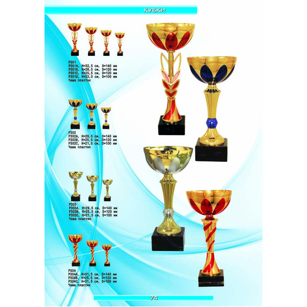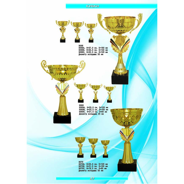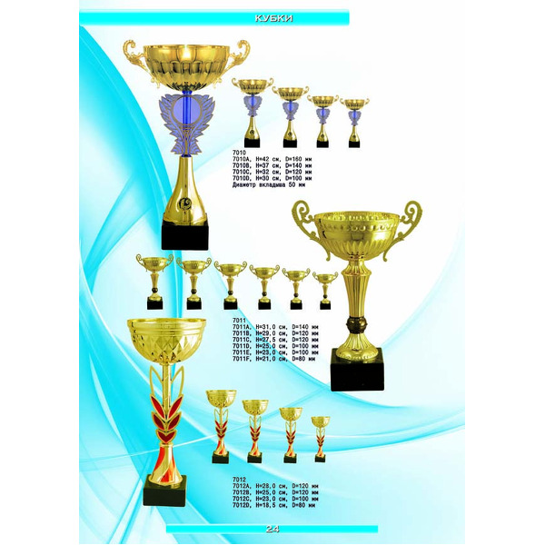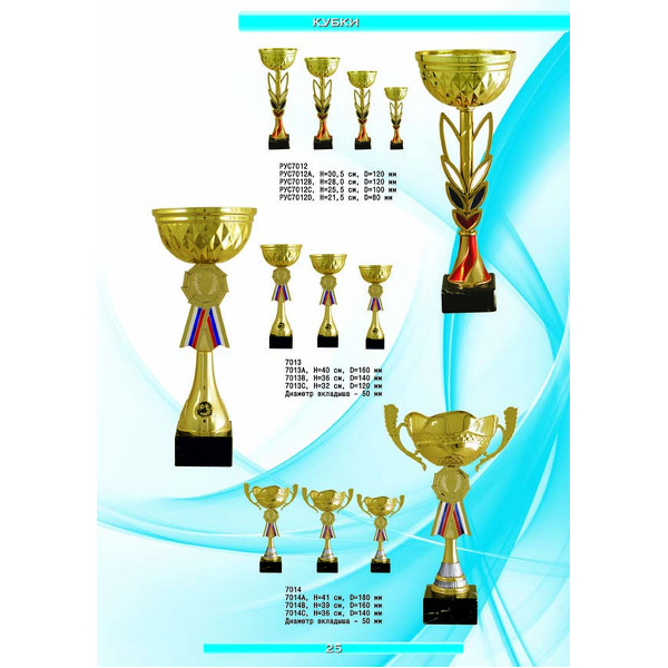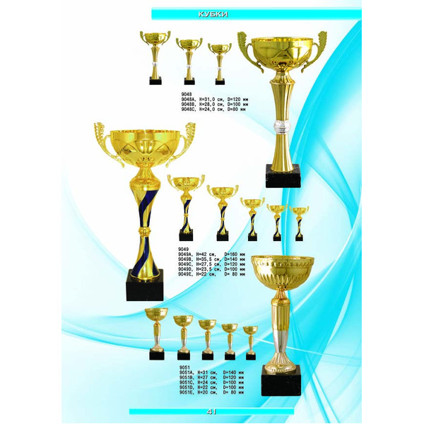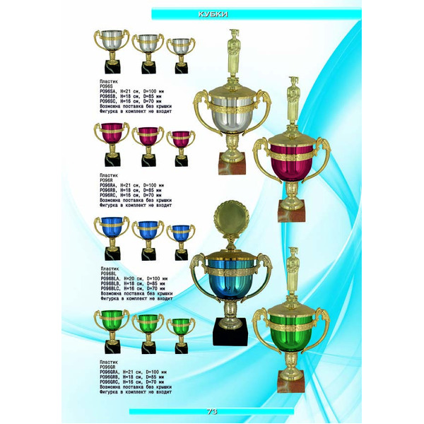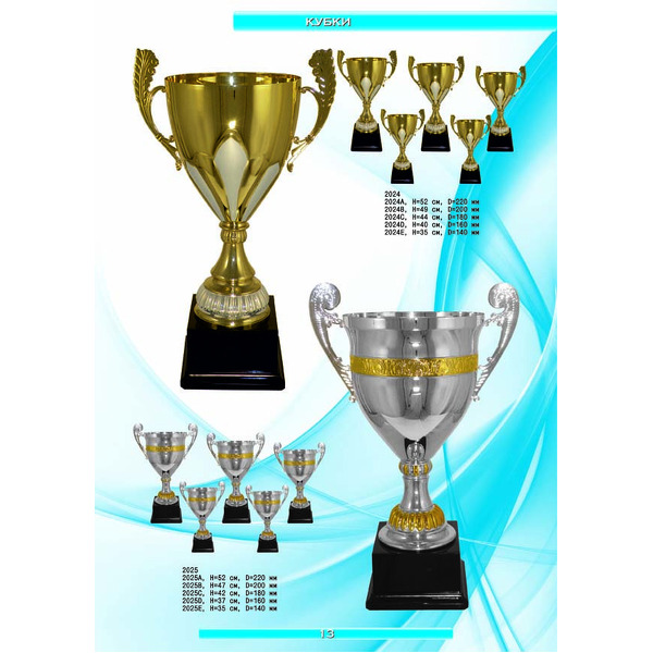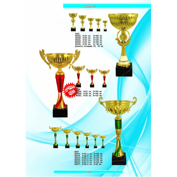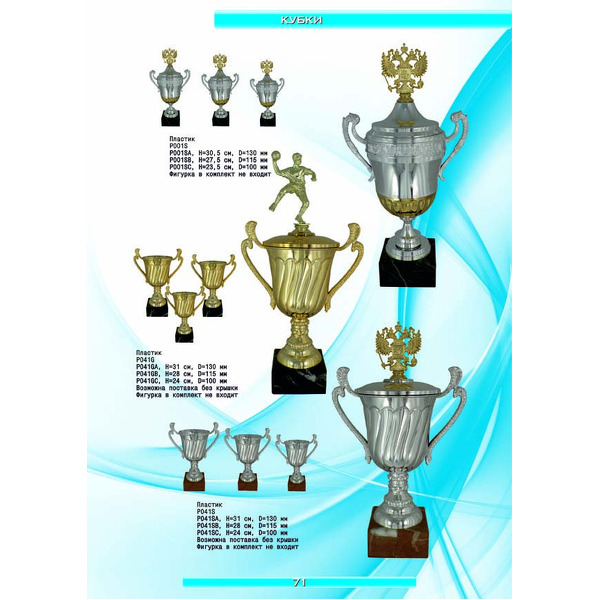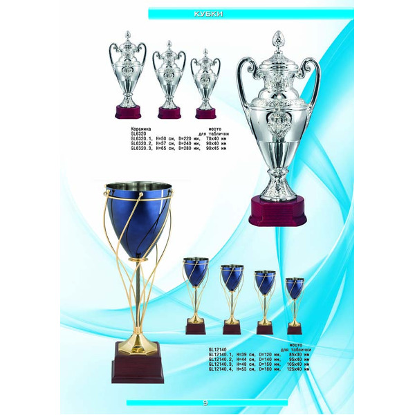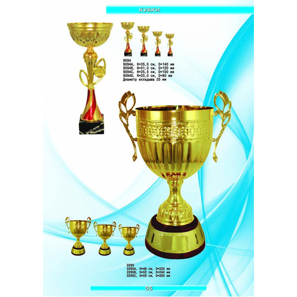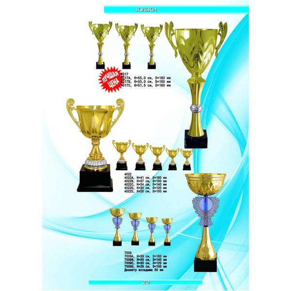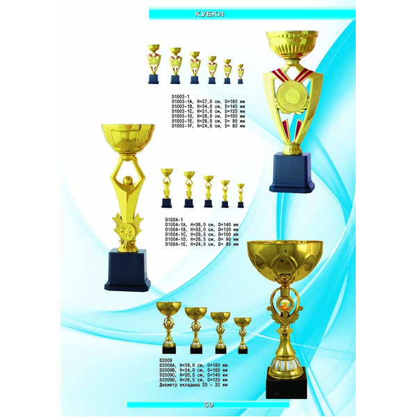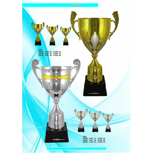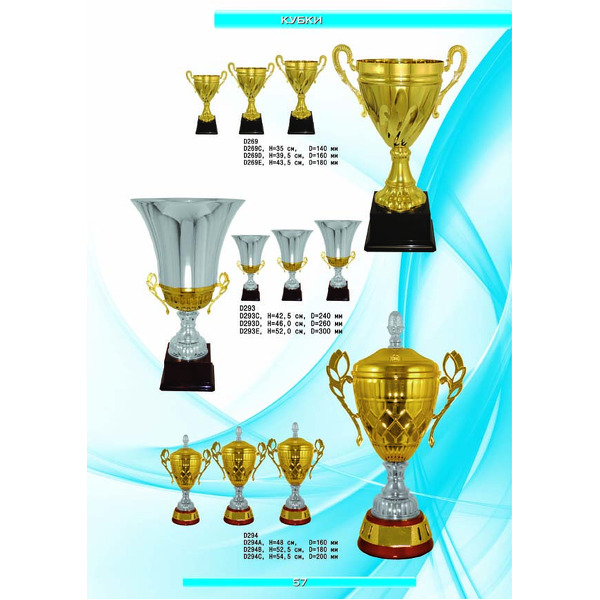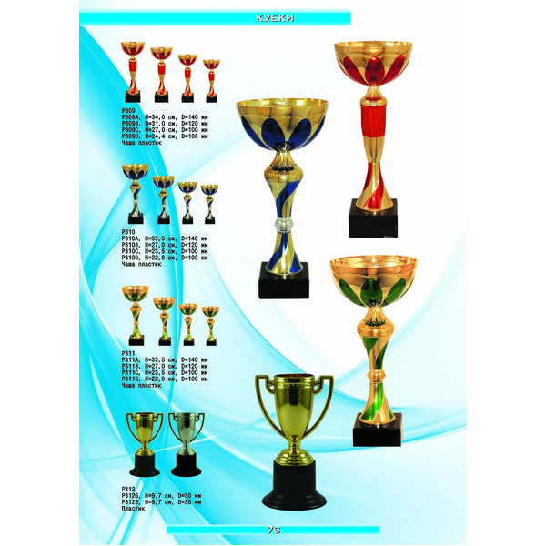 На нашем сайте вам будет удобно подобрать по иллюстрированному каталогу и заказать наградные кубки из металла и пластика, а также другие виды наградной продукции. В ассортименте представлены самые разнообразные по габаритам, форме, цветовой гамме и дизайну кубки, которые можно использовать для награждения победителей в различных соревнованиях, а также в качестве подарочной корпоративной продукции. У нас вы можете не только приобрести кубок, но и заказать нанесение на него различных надписей и изображений с применением технологии гравировки лазерным лучом.