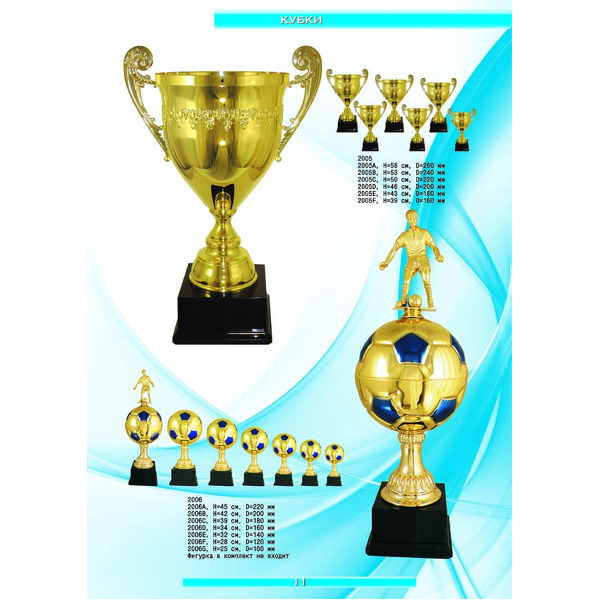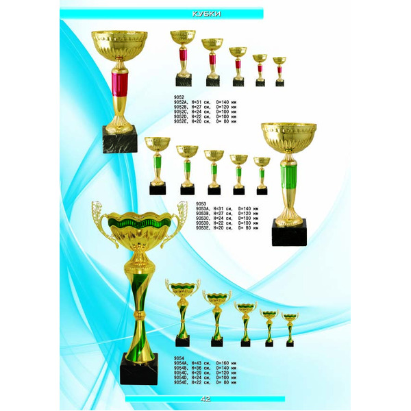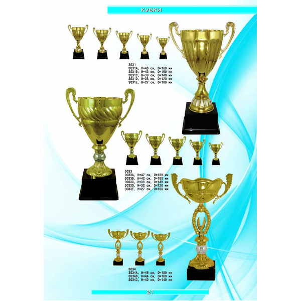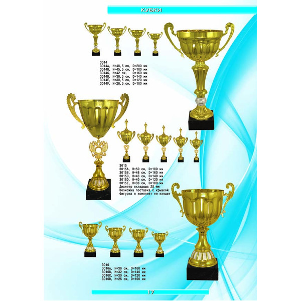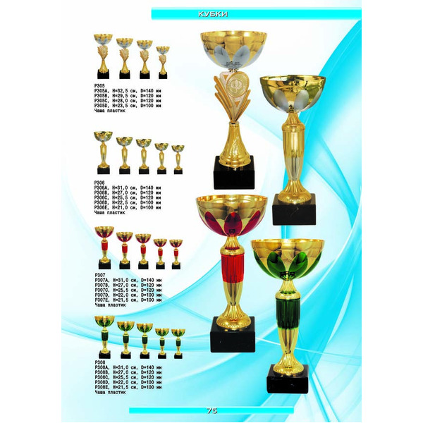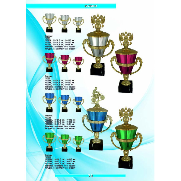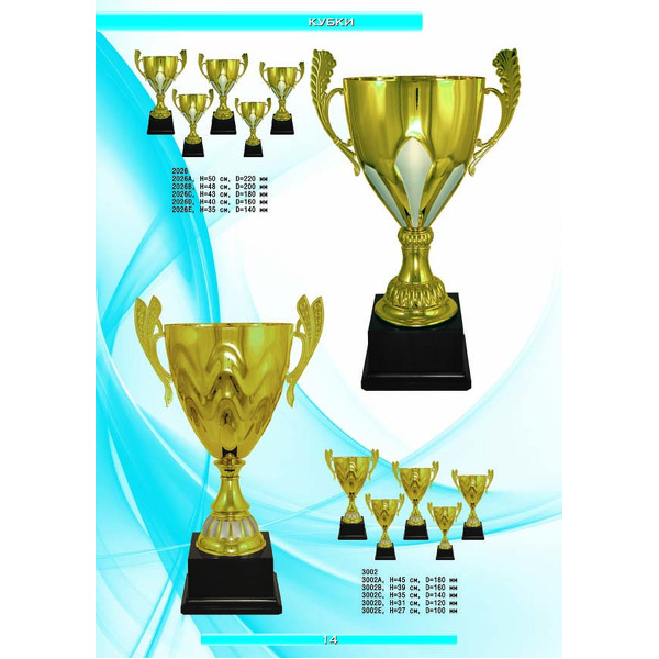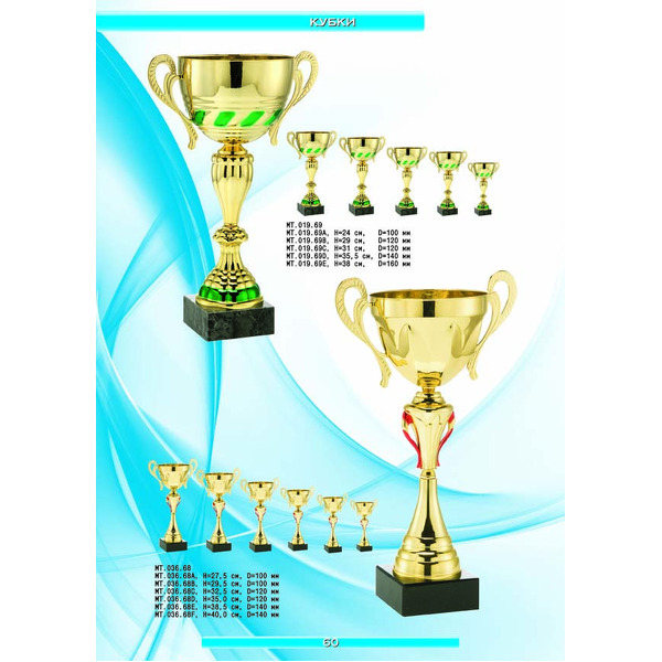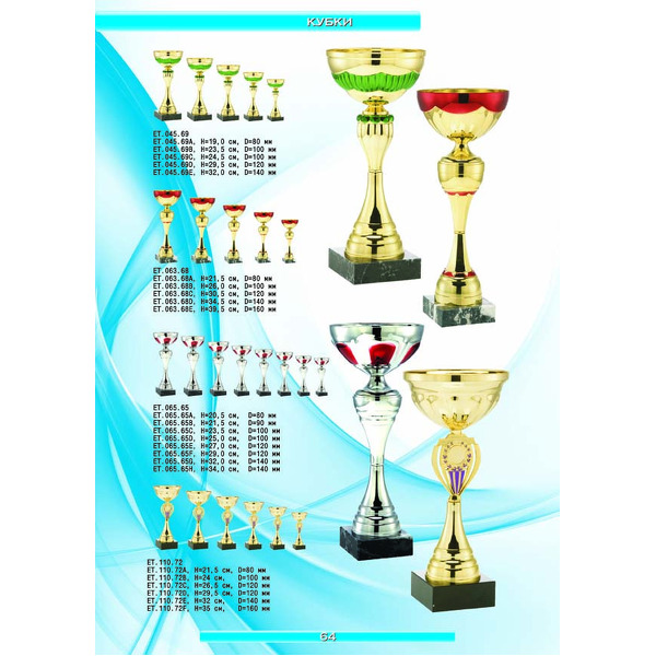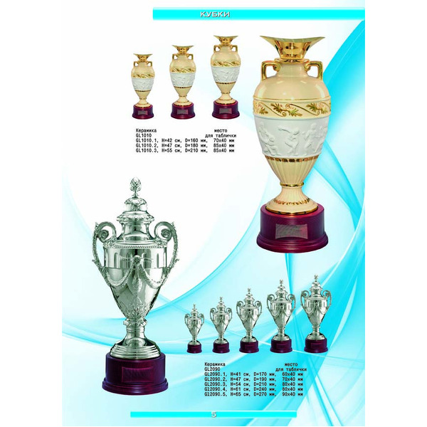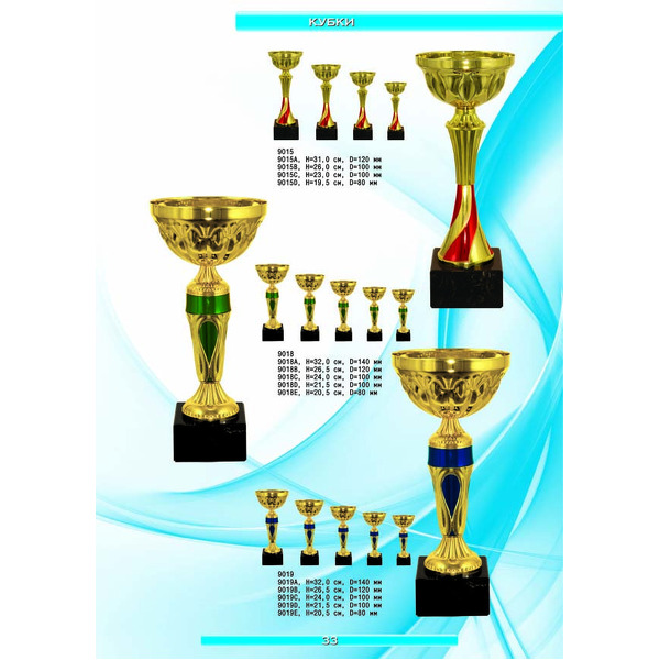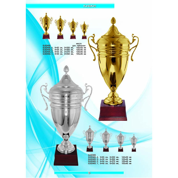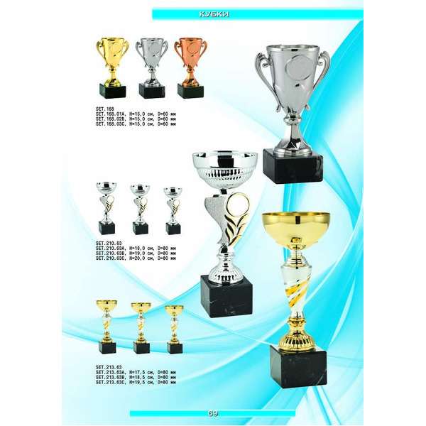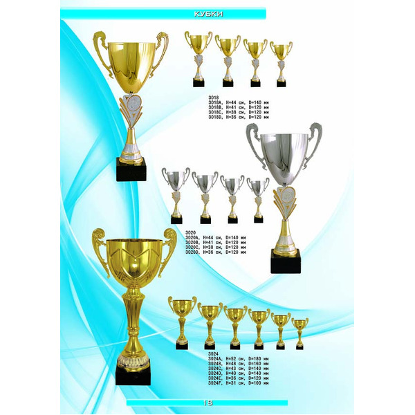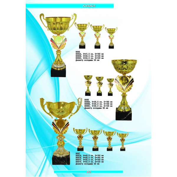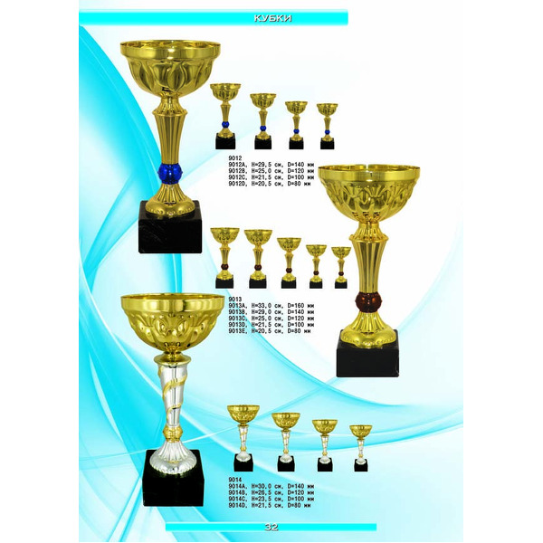 На нашем сайте вам будет удобно подобрать по иллюстрированному каталогу и заказать наградные кубки из металла и пластика, а также другие виды наградной продукции. В ассортименте представлены самые разнообразные по габаритам, форме, цветовой гамме и дизайну кубки, которые можно использовать для награждения победителей в различных соревнованиях, а также в качестве подарочной корпоративной продукции. У нас вы можете не только приобрести кубок, но и заказать нанесение на него различных надписей и изображений с применением технологии гравировки лазерным лучом.