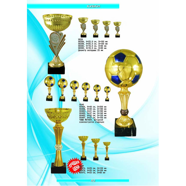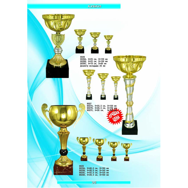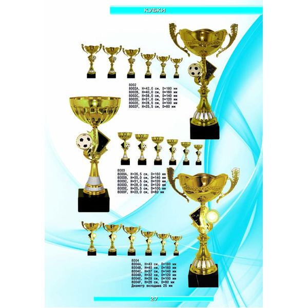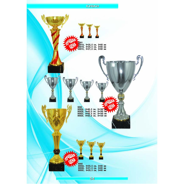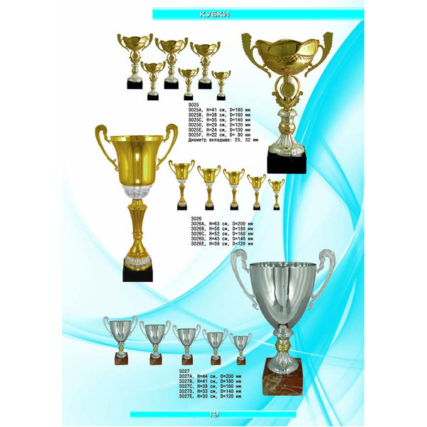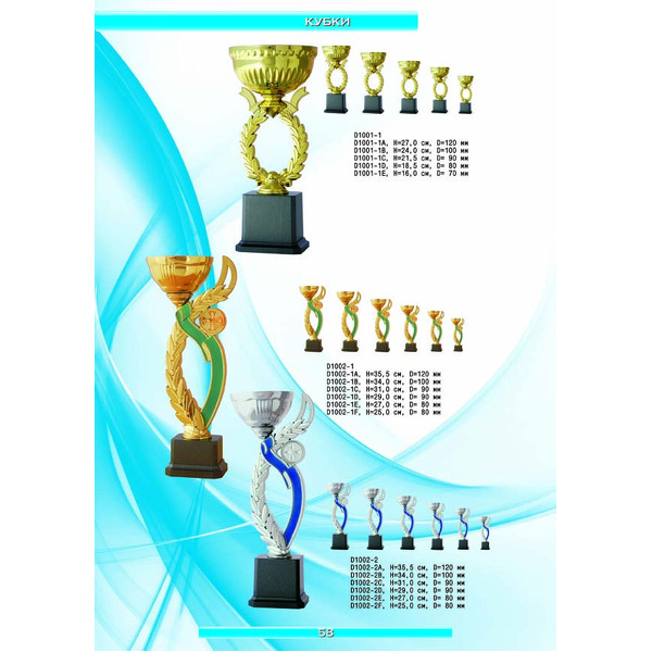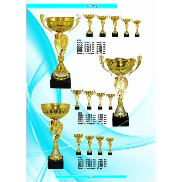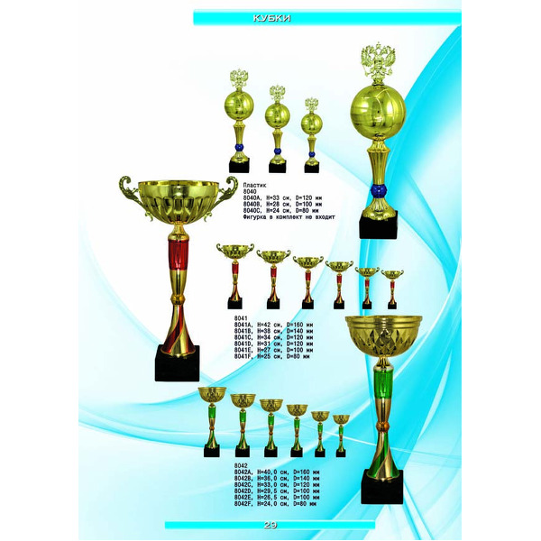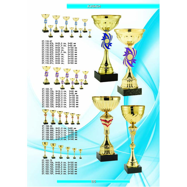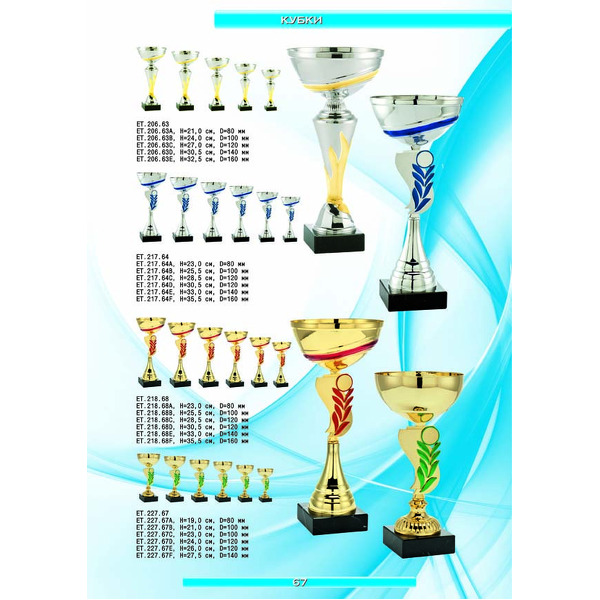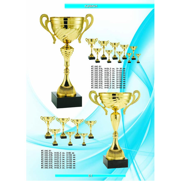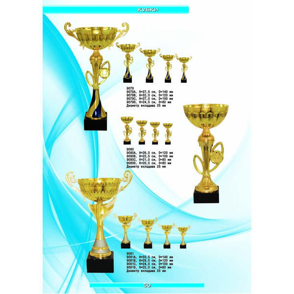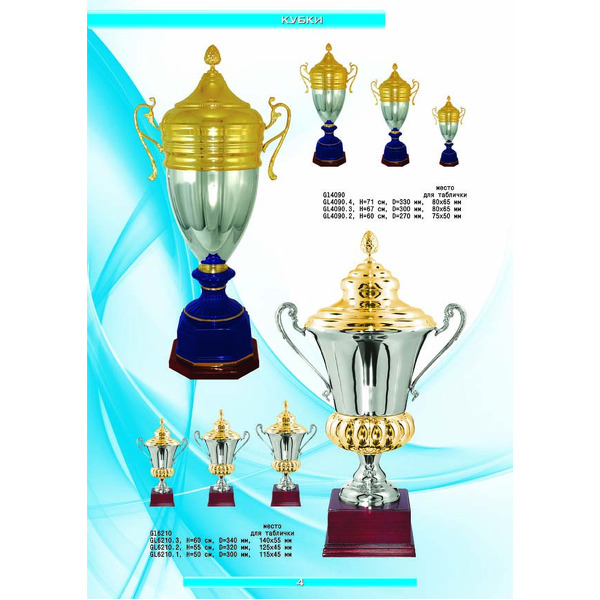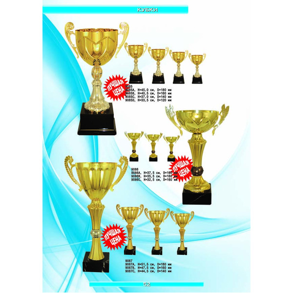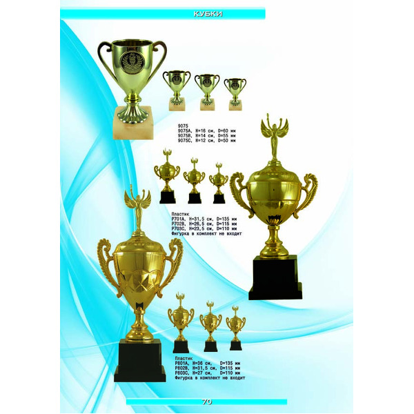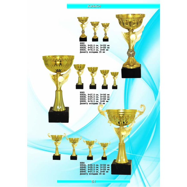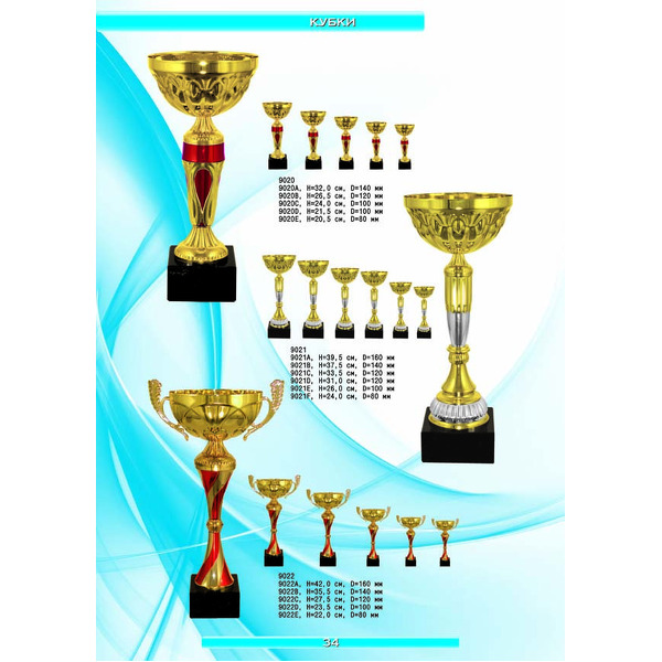 На нашем сайте вам будет удобно подобрать по иллюстрированному каталогу и заказать наградные кубки из металла и пластика, а также другие виды наградной продукции. В ассортименте представлены самые разнообразные по габаритам, форме, цветовой гамме и дизайну кубки, которые можно использовать для награждения победителей в различных соревнованиях, а также в качестве подарочной корпоративной продукции. У нас вы можете не только приобрести кубок, но и заказать нанесение на него различных надписей и изображений с применением технологии гравировки лазерным лучом.
