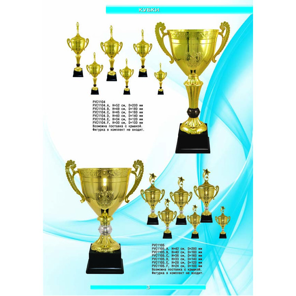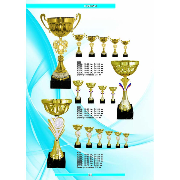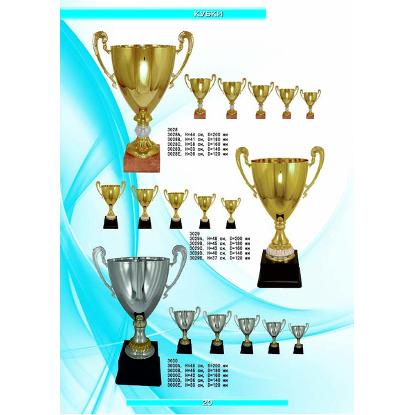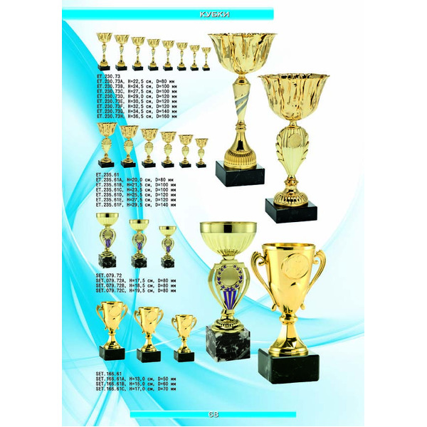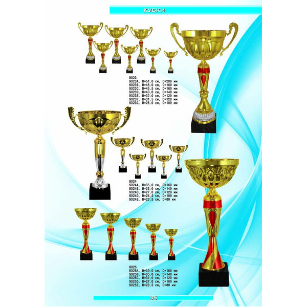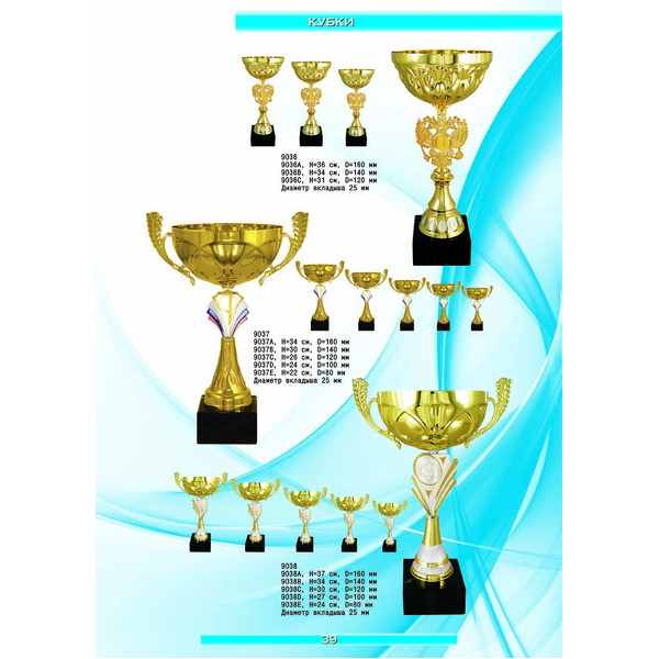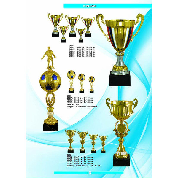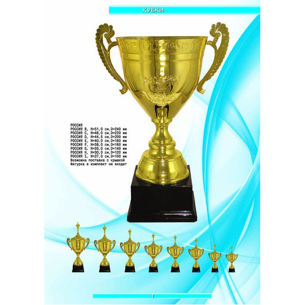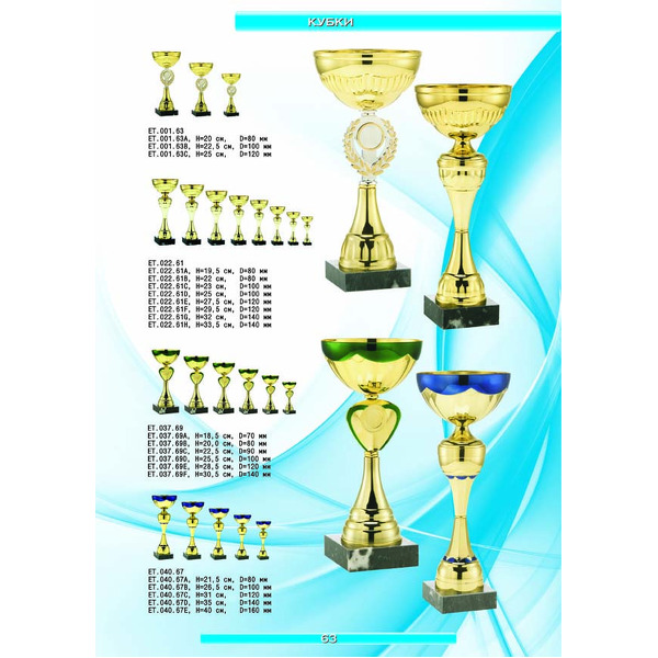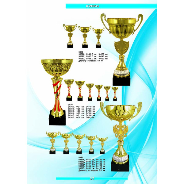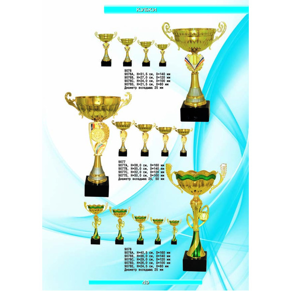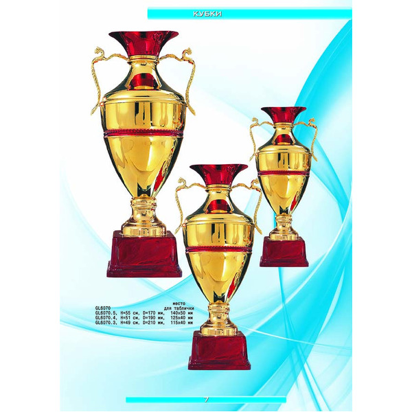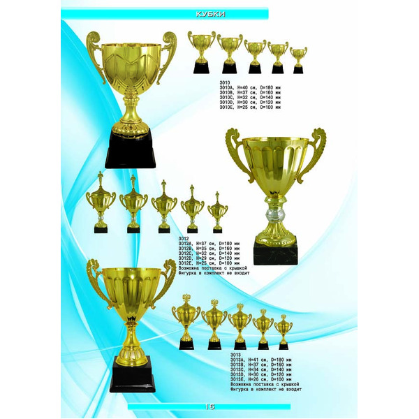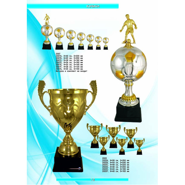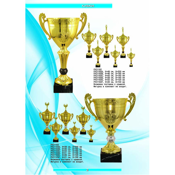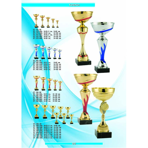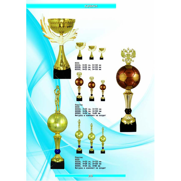 На нашем сайте вам будет удобно подобрать по иллюстрированному каталогу и заказать наградные кубки из металла и пластика, а также другие виды наградной продукции. В ассортименте представлены самые разнообразные по габаритам, форме, цветовой гамме и дизайну кубки, которые можно использовать для награждения победителей в различных соревнованиях, а также в качестве подарочной корпоративной продукции. У нас вы можете не только приобрести кубок, но и заказать нанесение на него различных надписей и изображений с применением технологии гравировки лазерным лучом.