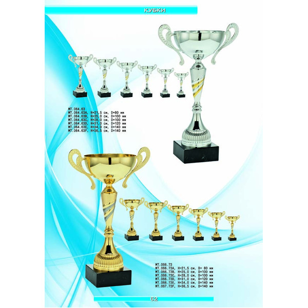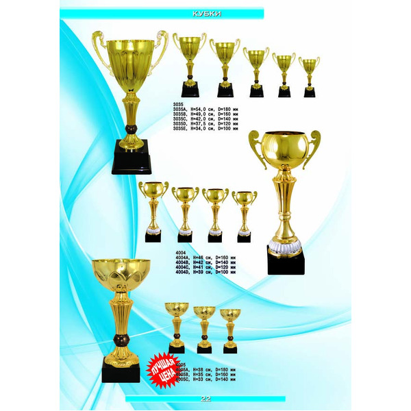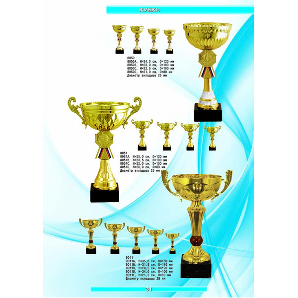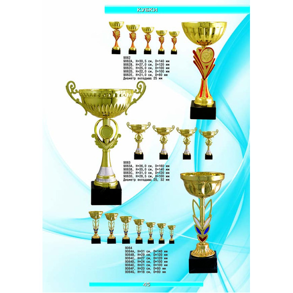 На нашем сайте вам будет удобно подобрать по иллюстрированному каталогу и заказать наградные кубки из металла и пластика, а также другие виды наградной продукции. В ассортименте представлены самые разнообразные по габаритам, форме, цветовой гамме и дизайну кубки, которые можно использовать для награждения победителей в различных соревнованиях, а также в качестве подарочной корпоративной продукции. У нас вы можете не только приобрести кубок, но и заказать нанесение на него различных надписей и изображений с применением технологии гравировки лазерным лучом.